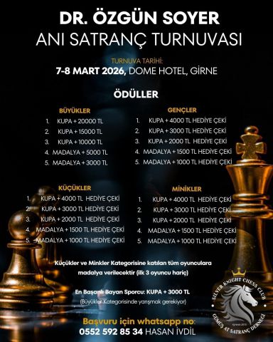28 Şubat - 5 Nisan 2026 tarihleri arasında düzenlenecek olan SPLAT 2026 KKSF SATRANÇ LİGLERİ'nin başvuru süresi bugün ( 16 Şubat 2026) dolmaktadır. Takım listelerini göndermeyen takımlarımızın [email protected] mail adresine göndermesini rica ederiz.